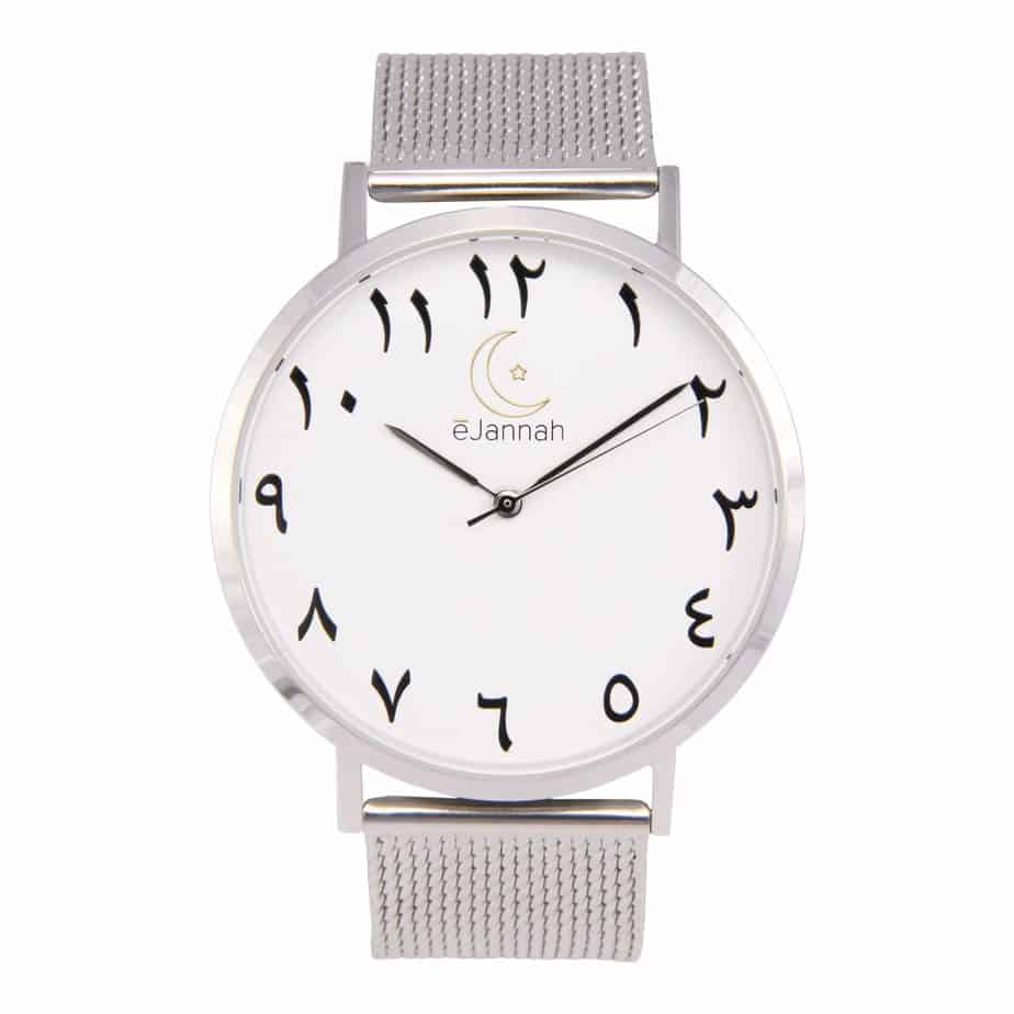 An impressive watch with a silver mesh strap and pearl white dial. Arabic numerals make this into a specially unique piece. Add this stylish watch to your collection for casual everyday wear or for special occasions. Comes in a sleek black case with the eJannah logo. Perfect as a gift for a special one or a treat for yourself.