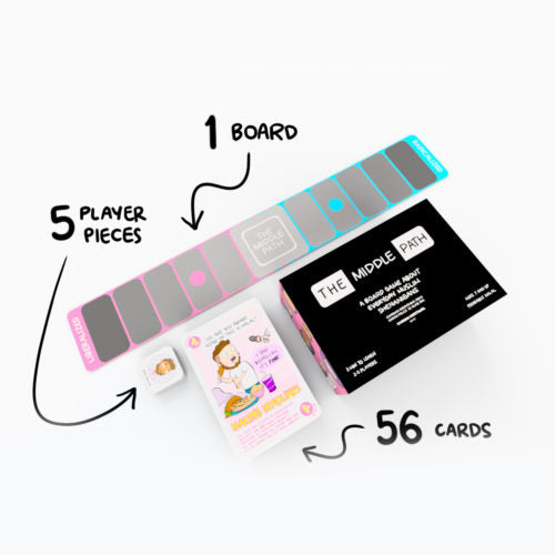 Each player will take turns drawing cards from the deck. There are Attack cards, which move you away from the Middle Path, unless you have the correct defend card. Kind Deed cards will take you to the center of the board, unless and opponent ‘steals’ or ‘obstructs’ your kind deeds.