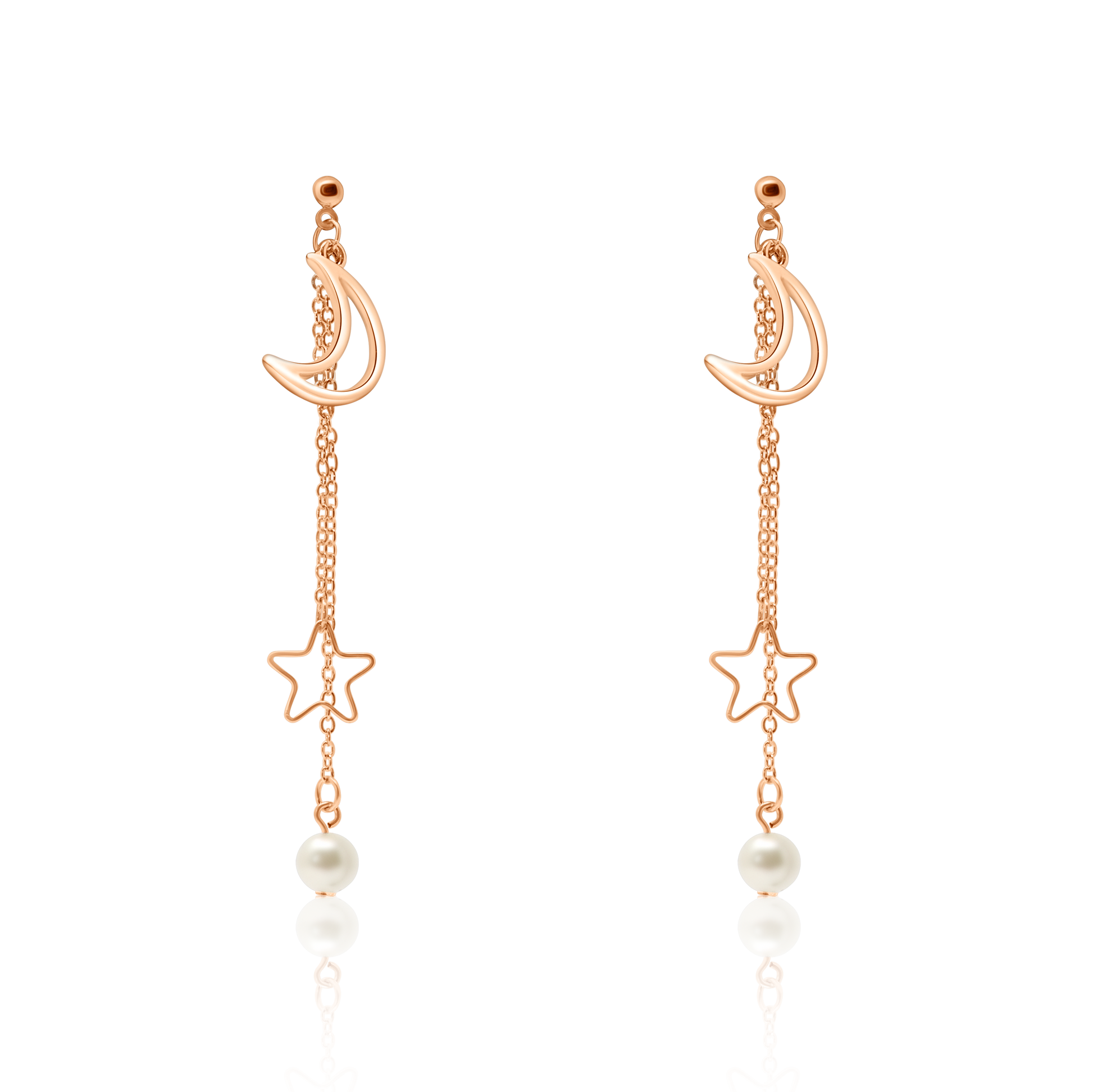 Add this stylish and beautiful celestial design to your jewelry collection. Features a crescent moon at the top with two drop chains ending in a star and moon pearl.