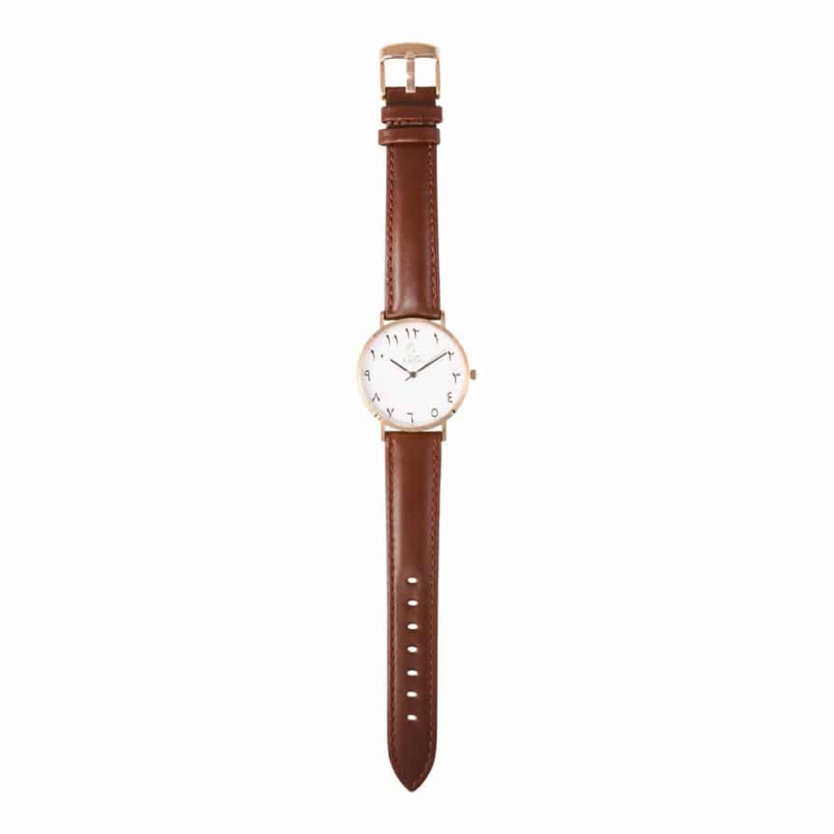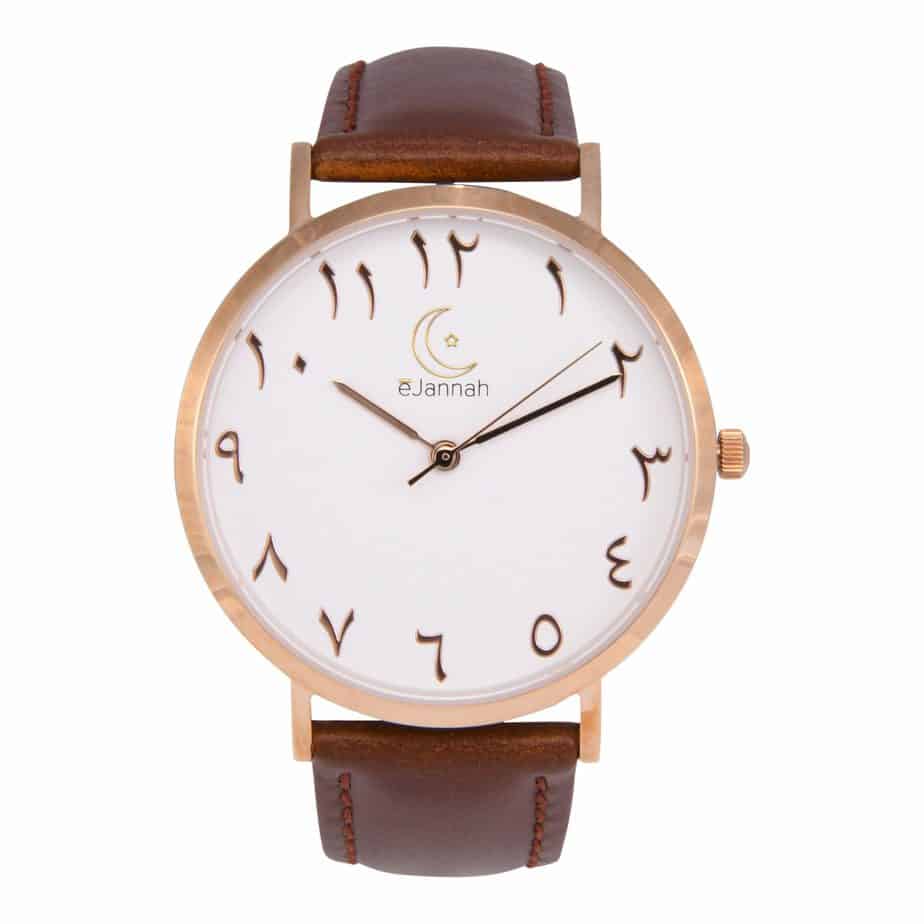 Beautiful brown leather strap combined with a luminous white dial and a rose gold case featuring Arabic numerals. Add this trendy color to your collection for casual everyday wear. Comes in a sleek black case with the eJannah logo. Perfect as a gift for a special one or a treat for yourself.